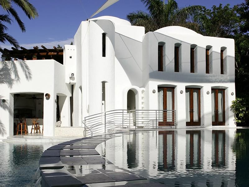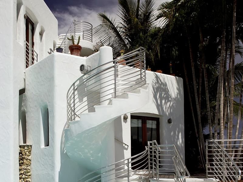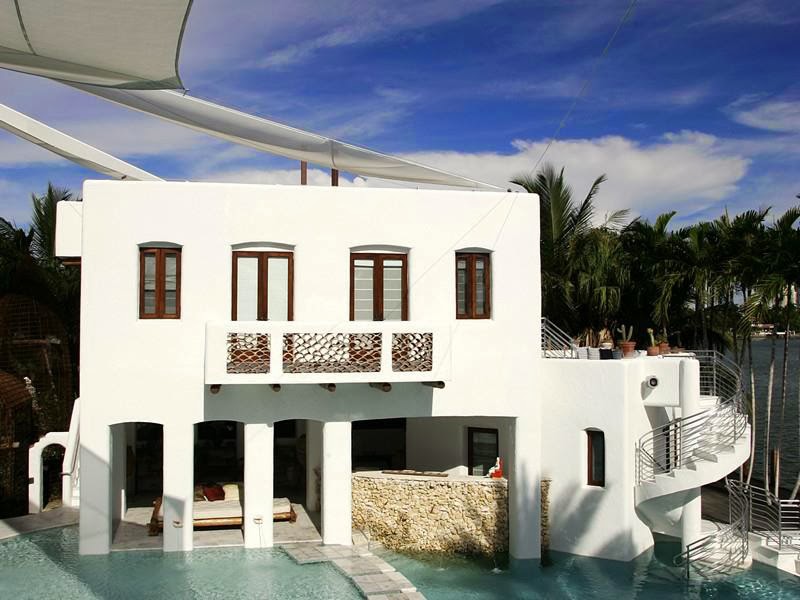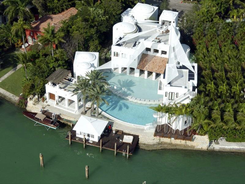 This modern Mediterranean-style estate has been featured in multiple magazines, movies, and videos. The luxury compound sits on 0.45 acres and includes 150 feet of water frontage. The property consists of the main house, guest house, boat house, and cabana, all set with tiered pools connected by walkways.
