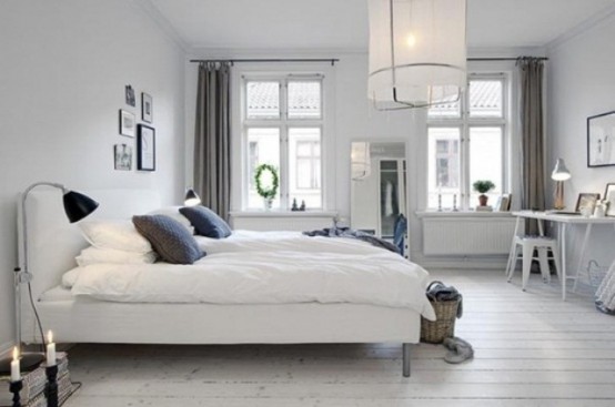 Minimalism is similar to modern design in that it emphasis a very clean, simple look without a lot of adornment. Often, midcentury modern furniture is chosen for this “less is more” life and decorating philosophy. This gray and white minimalist bedroom from A. Gruppo Architects uses a colorful painting to add a spark of color.