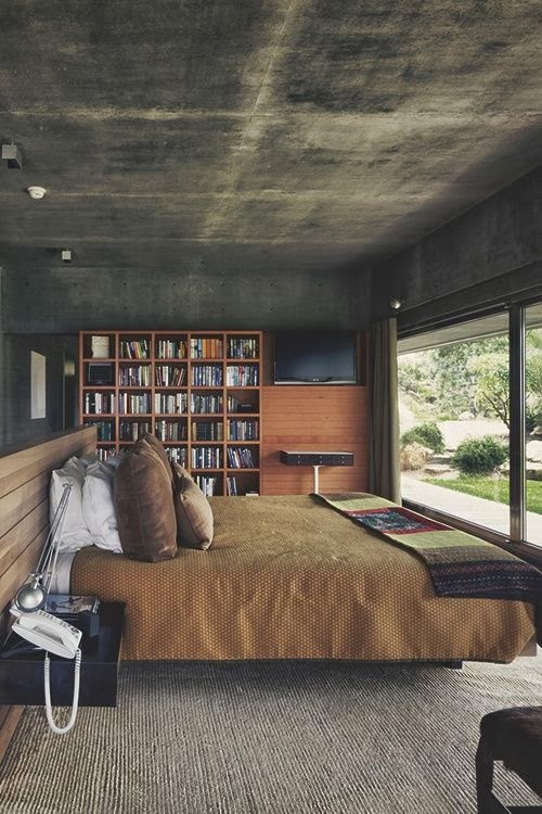 Hanging light fixtures break up the mostly horizontal planes of a modern bedroom. This peaceful, beautiful master bedroom uses copper pendants to great effect. So serene and lovely.